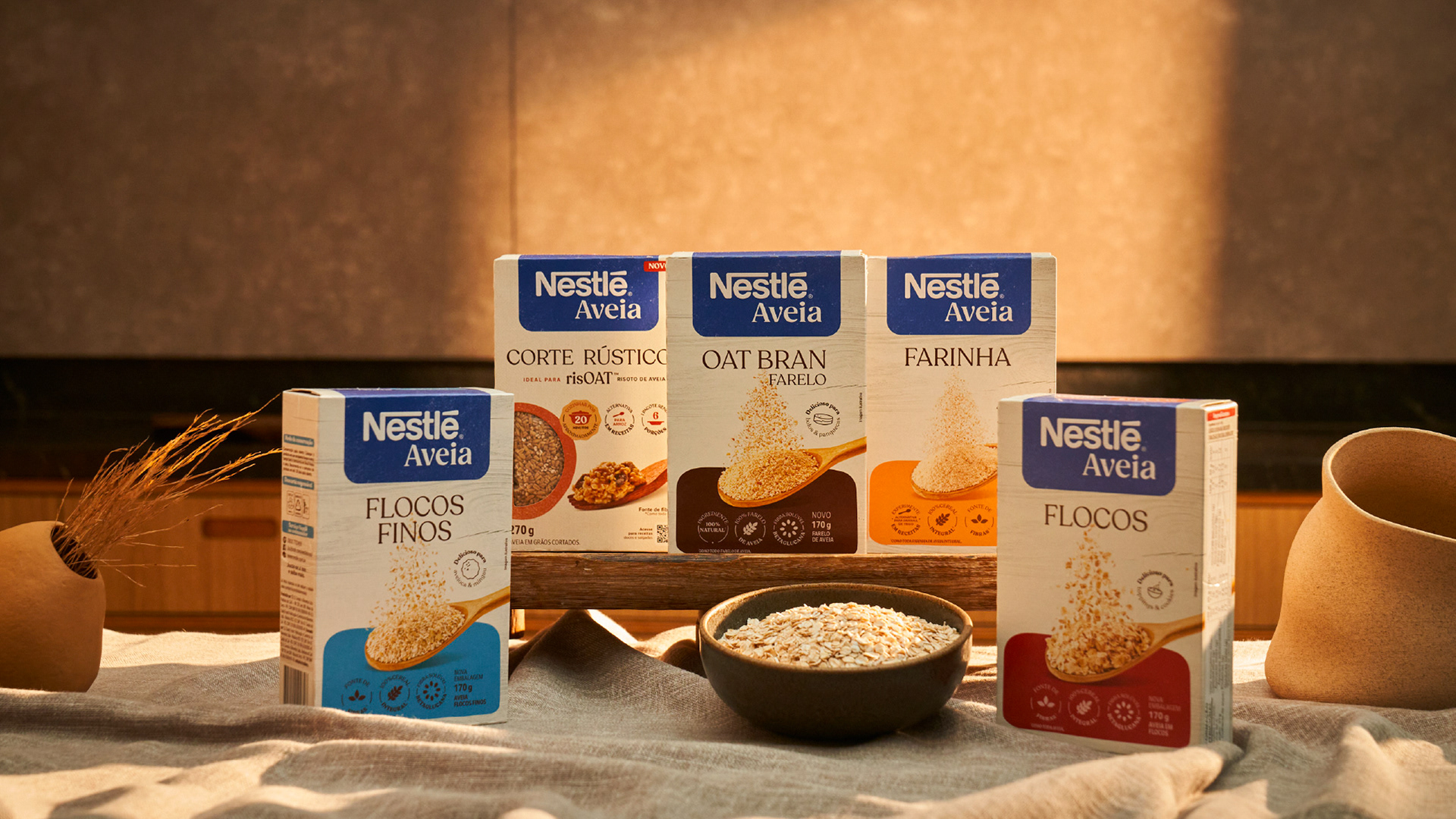Conceito: Nestlé Aveia é sobre admirar a organicidade das texturas e formas de cada grão. E mais do que isso, é trazer este olhar para a vida. É sobre estar bem ao ponto de ver o que há de belo também no que parece falha. Inspirada pelo conceito japonês Wabi-Sabi, Nesté Aveia traz a beleza das imperfeições como fio narrativo para uma história visual leve e despretensiosa, com composições de cena, materiais, utensílios e luminosidade que se permitem ser imperfeitos.